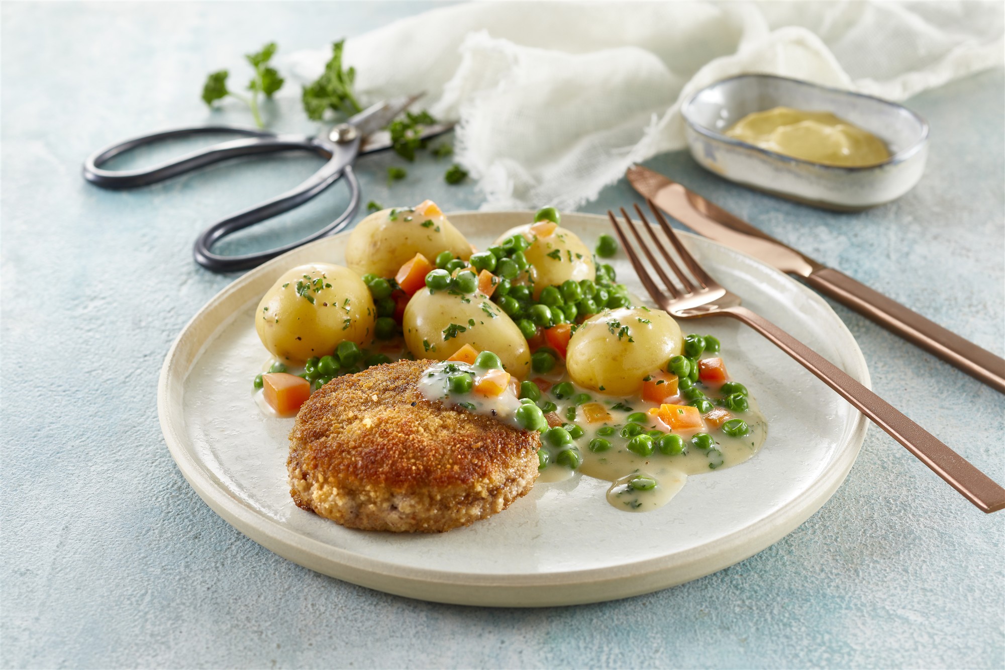 Karbonader m/ stuvede ærter og gulerødder, hvide kartofler og surt
